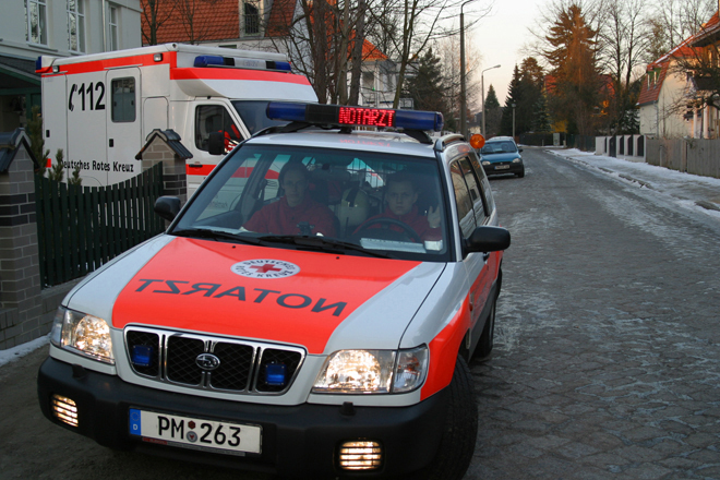 Der Rettungswagen springt an. Frau Doktor Lubasch, die Notärztin, setzt sich zu mir, Herr Panter rutscht einen Platz weiter, beide schnallen sich an. Die Ärztin füllt das Rettungsdienstprotokoll aus. „Da halte ich fest, wie wir Sie vorgefunden haben, und was wir mit Ihnen gemacht haben.“, erläutert sie. Ob sie immer auf den Rettungswagen umsteige, frage ich. Ja, so funktioniere dieses Rendezvous-System. „Wir treffen, aus verschiedenen Richtungen kommend, am Unfallort ein, arbeiten dann als Team zusammen und fahren gemeinsam zum Krankenhaus. Zu meinen Aufgaben gehört es, den Patienten auf dem Weg dorthin zu betreuen. Das NEF fährt also ohne mich zurück.“ Auf meine Frage, wie denn die Arbeit als Notärztin sei, antwortet sie: “Ich mach`  das ja schon eine ganze Weile. Und ich kann mir zurzeit nichts Besseres vorstellen als genau diese Arbeit in diesem Team!“